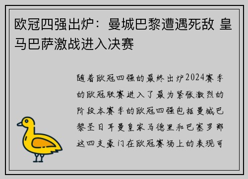 • 欧冠四强出炉:曼城巴黎遭遇死敌 皇马巴萨激战进入决赛