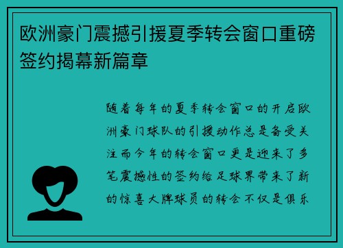 • 欧洲豪门震撼引援夏季转会窗口重磅签约揭幕新篇章