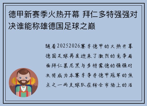 随着2025-2026赛季德甲的火热开幕,德国足球再度迎来了激烈的竞争局面。拜仁慕尼黑与多特蒙德的强强对决,将成为本赛季争夺德甲冠军的焦点之一。两支球队在转会市场上的活跃表现和球员阵容的强大,使得本赛...