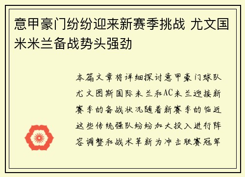 本篇文章将详细探讨意甲豪门球队尤文图斯、国际米兰和AC米兰迎接新赛季的备战状况。随着新赛季的临近,这些传统强队纷纷加大投入,进行阵容调整和战术革新,为冲击联赛冠军和欧洲赛事荣誉做足准备。从人员引进到战...