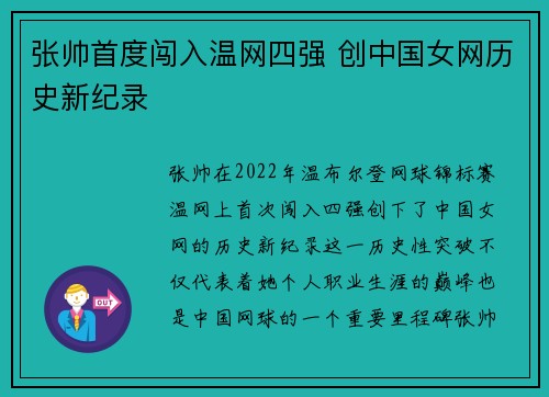 张帅在2022年温布尔登网球锦标赛(温网)上首次闯入四强,创下了中国女网的历史新纪录。这一历史性突破不仅代表着她个人职业生涯的巅峰,也是中国网球的一个重要里程碑。张帅的成功不只是技术上的体现,更是在精...