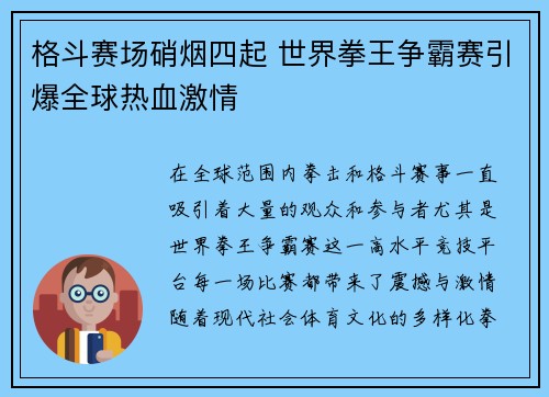 在全球范围内,拳击和格斗赛事一直吸引着大量的观众和参与者,尤其是世界拳王争霸赛这一高水平竞技平台,每一场比赛都带来了震撼与激情。随着现代社会体育文化的多样化,拳击这一传统的格斗运动通过越来越丰富的赛事...