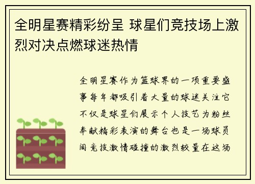 全明星赛作为篮球界的一项重要盛事,每年都吸引着大量的球迷关注。它不仅是球星们展示个人技艺、为粉丝奉献精彩表演的舞台,也是一场球员间竞技激情碰撞的激烈较量。在这场盛会中,球员们不仅会通过精准的投篮、激烈...