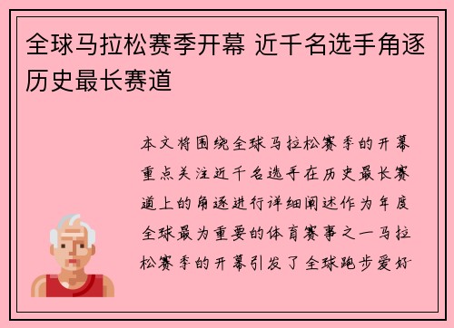 本文将围绕全球马拉松赛季的开幕,重点关注近千名选手在历史最长赛道上的角逐进行详细阐述。作为年度全球最为重要的体育赛事之一,马拉松赛季的开幕引发了全球跑步爱好者和运动员的热情。本次赛事的赛道长度创下历史...