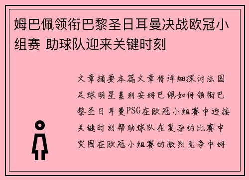 文章摘要:本篇文章将详细探讨法国足球明星基利安·姆巴佩如何领衔巴黎圣日耳曼(PSG)在欧冠小组赛中迎接关键时刻,帮助球队在复杂的比赛中突围。在欧冠小组赛的激烈竞争中,姆巴佩的表现无疑是巴黎圣日耳曼能够...