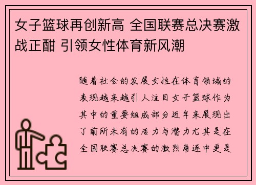 随着社会的发展,女性在体育领域的表现越来越引人注目。女子篮球作为其中的重要组成部分,近年来展现出了前所未有的活力与潜力,尤其是在全国联赛总决赛的激烈角逐中,更是突显了女子体育的实力与魅力。在这一背景下...