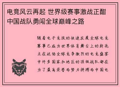 随着电子竞技的快速发展,全球电竞赛事已成为世界体育舞台上的新亮点。在这场全球竞争激烈的电竞盛宴中,许多国家和地区的顶级战队都在为了最高荣誉而努力拼搏。而中国电竞战队,凭借其强大的实力和不懈的奋斗,已经...