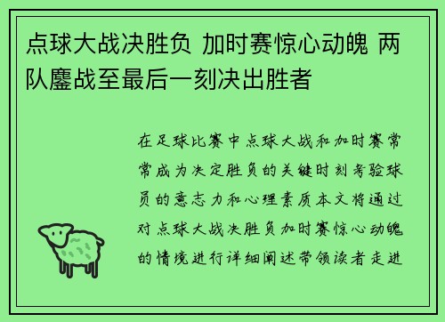 在足球比赛中,点球大战和加时赛常常成为决定胜负的关键时刻,考验球员的意志力和心理素质。本文将通过对点球大战决胜负、加时赛惊心动魄的情境进行详细阐述,带领读者走进那一场场鏖战的瞬间,感受两队如何在最后时...