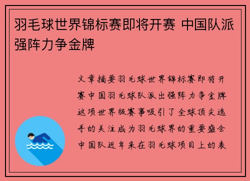 文章摘要:羽毛球世界锦标赛即将开赛,中国羽毛球队派出强阵,力争金牌。这项世界级赛事吸引了全球顶尖选手的关注,成为羽毛球界的重要盛会。中国队近年来在羽毛球项目上的表现一直强势,尤其是在男子单打、女子单打...