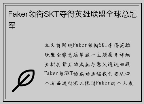 本文将围绕Faker领衔SKT夺得英雄联盟全球总冠军这一主题展开,详细分析其背后的成就与意义。通过回顾Faker与SKT的成功历程,我们将从四个方面进行深入探讨:Faker的个人表现与其对队伍的贡献,...